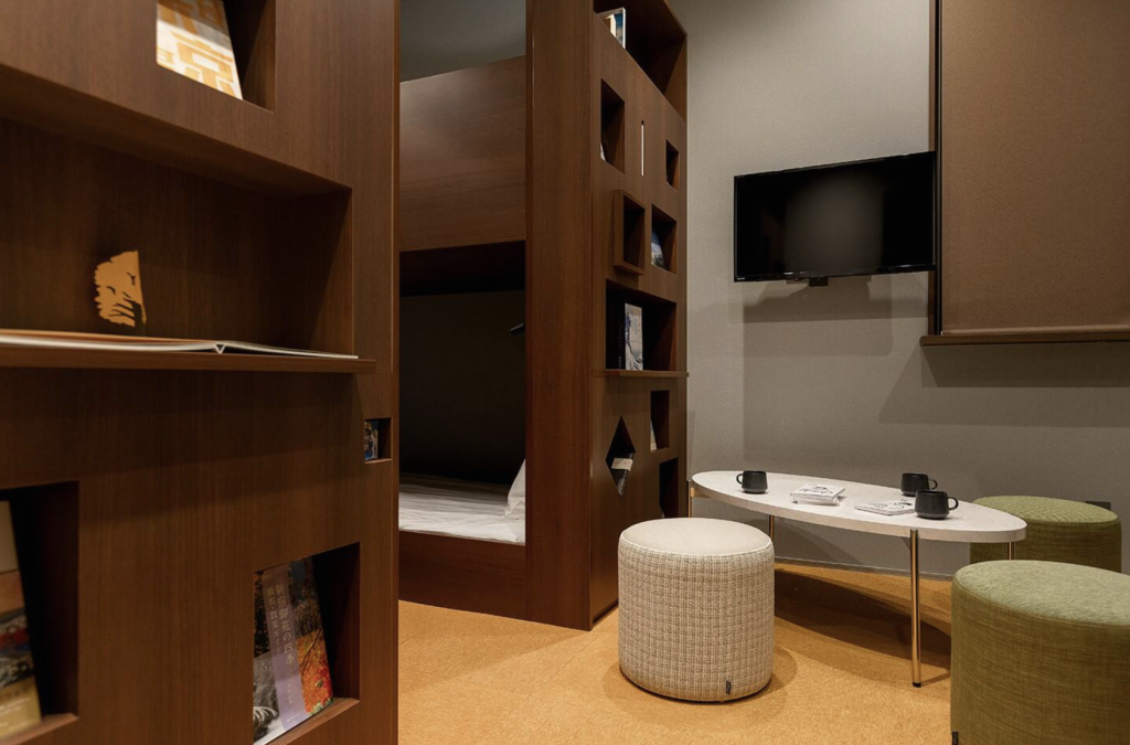In the capsules, we offer cocoon-shaped private areas that create a private space, allowing you to stretch out and relax comfortably.
