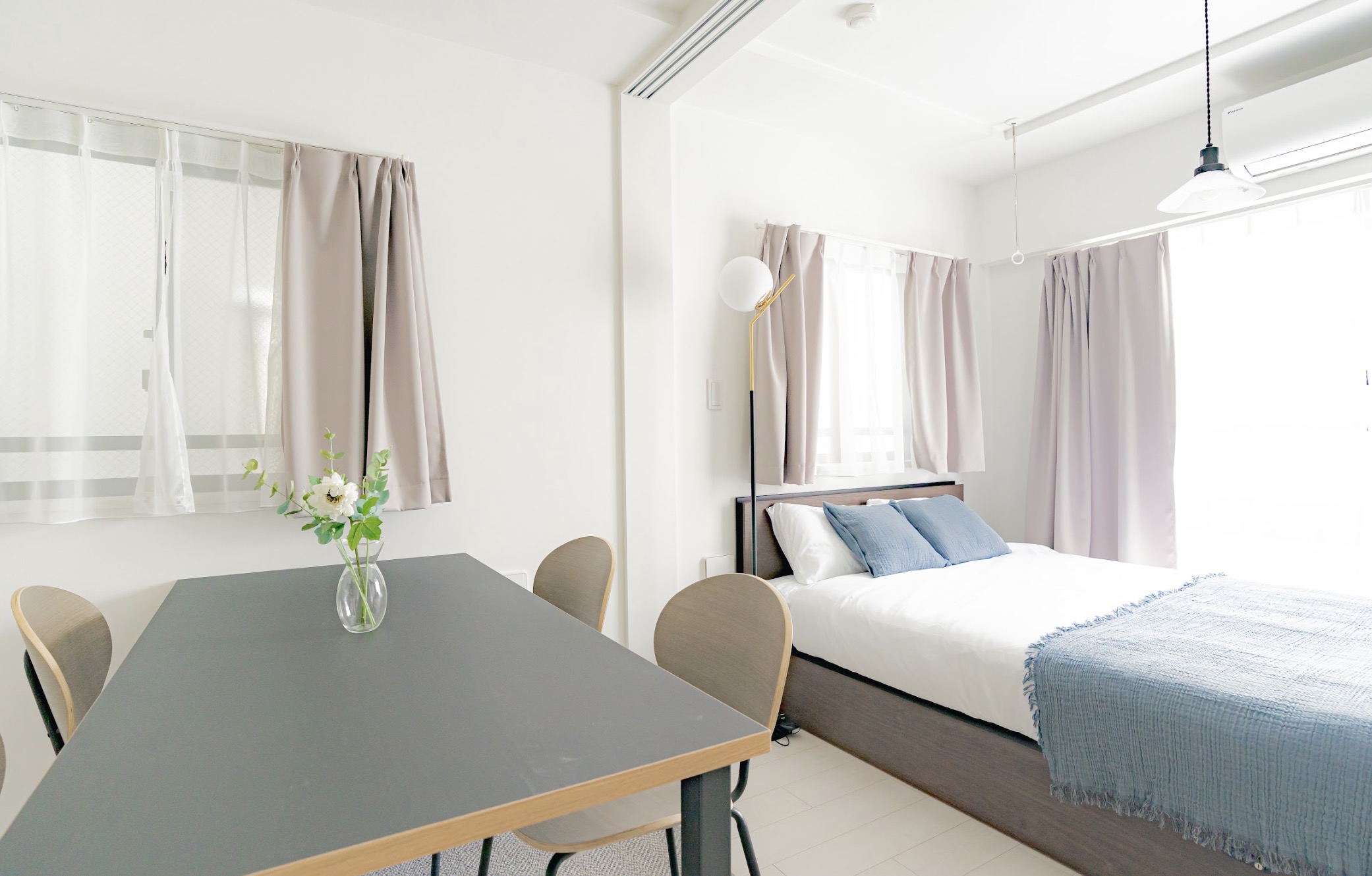 The house is designed in a girly white base. It features cute wallpaper everywhere. Up to 5 people can move in in 3 bedrooms (1 double bed/1 double bed/1 semi-double bed). Furnished and appliances are included, so you can reduce the initial cost when moving in.