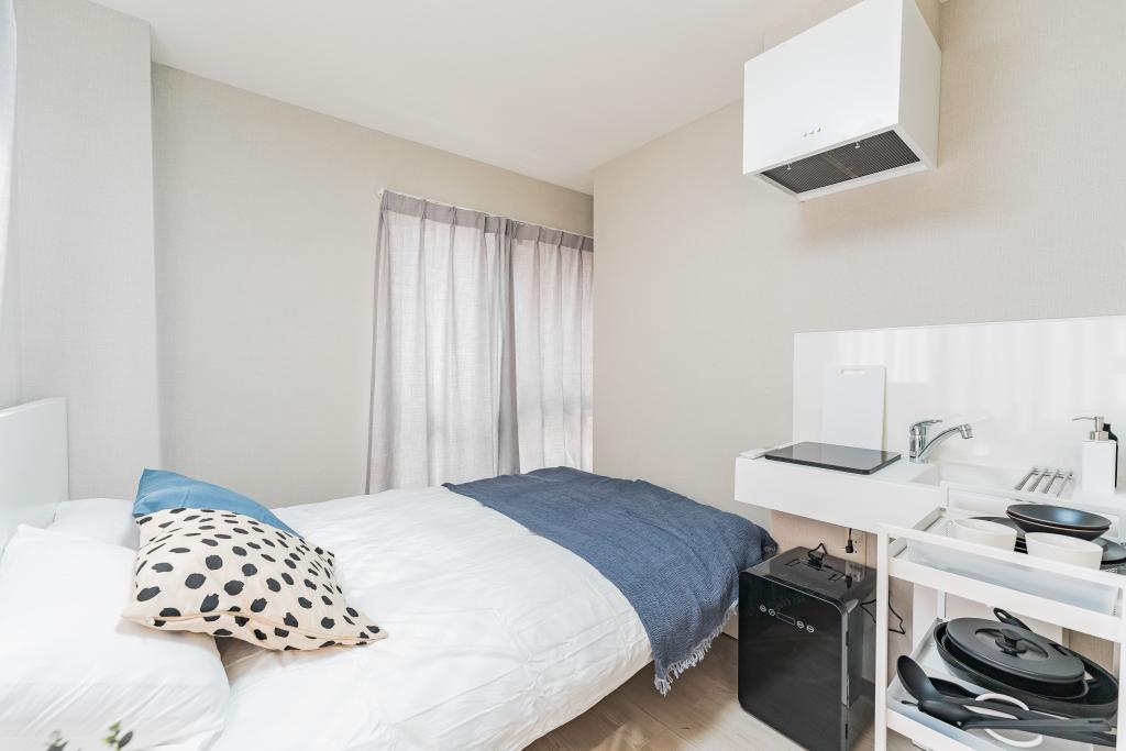The interior features a calming design incorporating the unito color blue. Under the bed, there is a large storage space called a "Re-rent Box," allowing ample storage for luggage even when staying away from home. Each guest room is equipped with a unit bath, workspace, TV, refrigerator, and kitchen, ensuring a comfortable urban living experience.